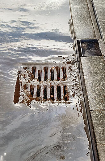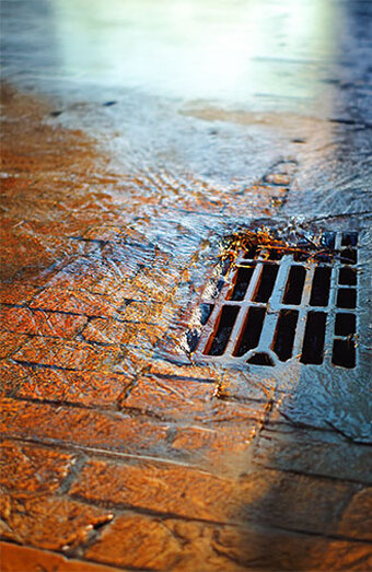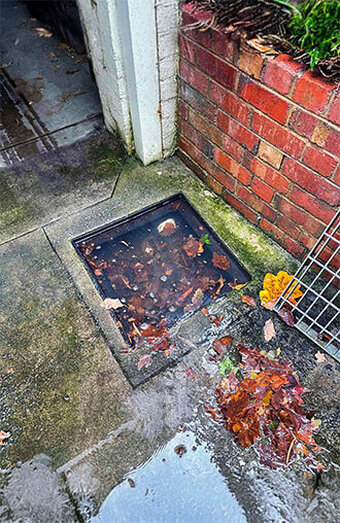 Emergency attendance for properties with water pooling in yards, driveways, or near structures due to blocked surface drains or strip grates.